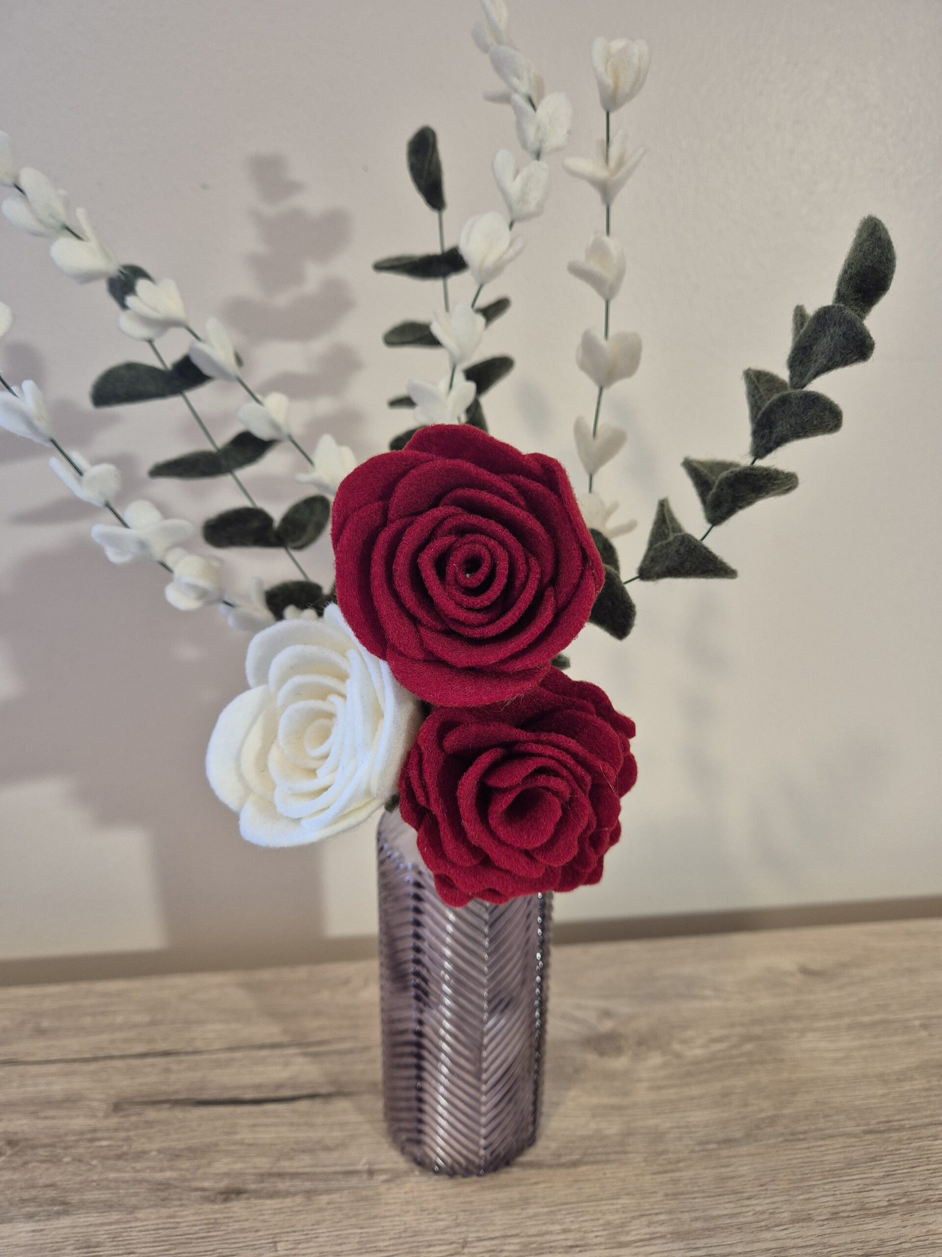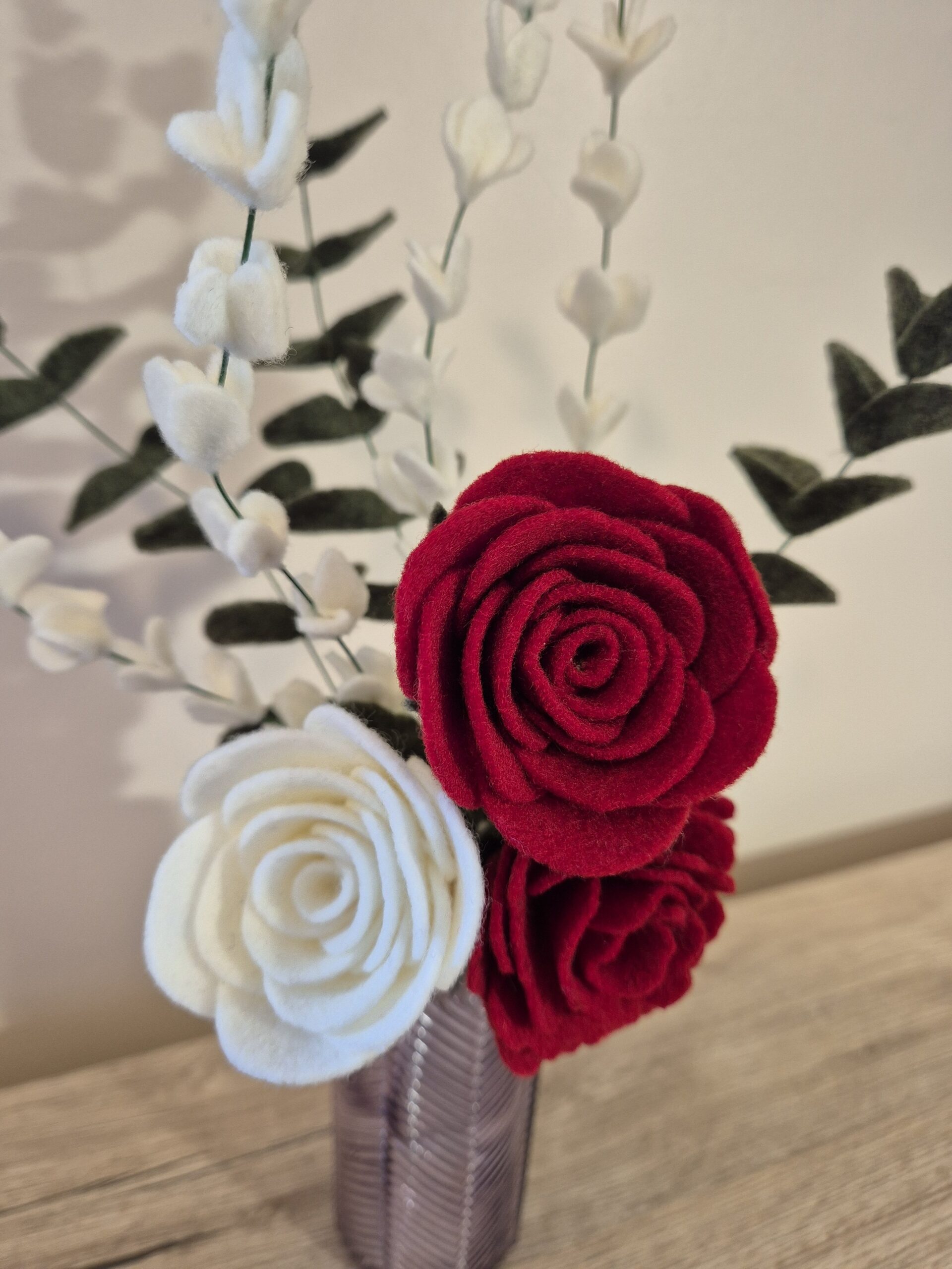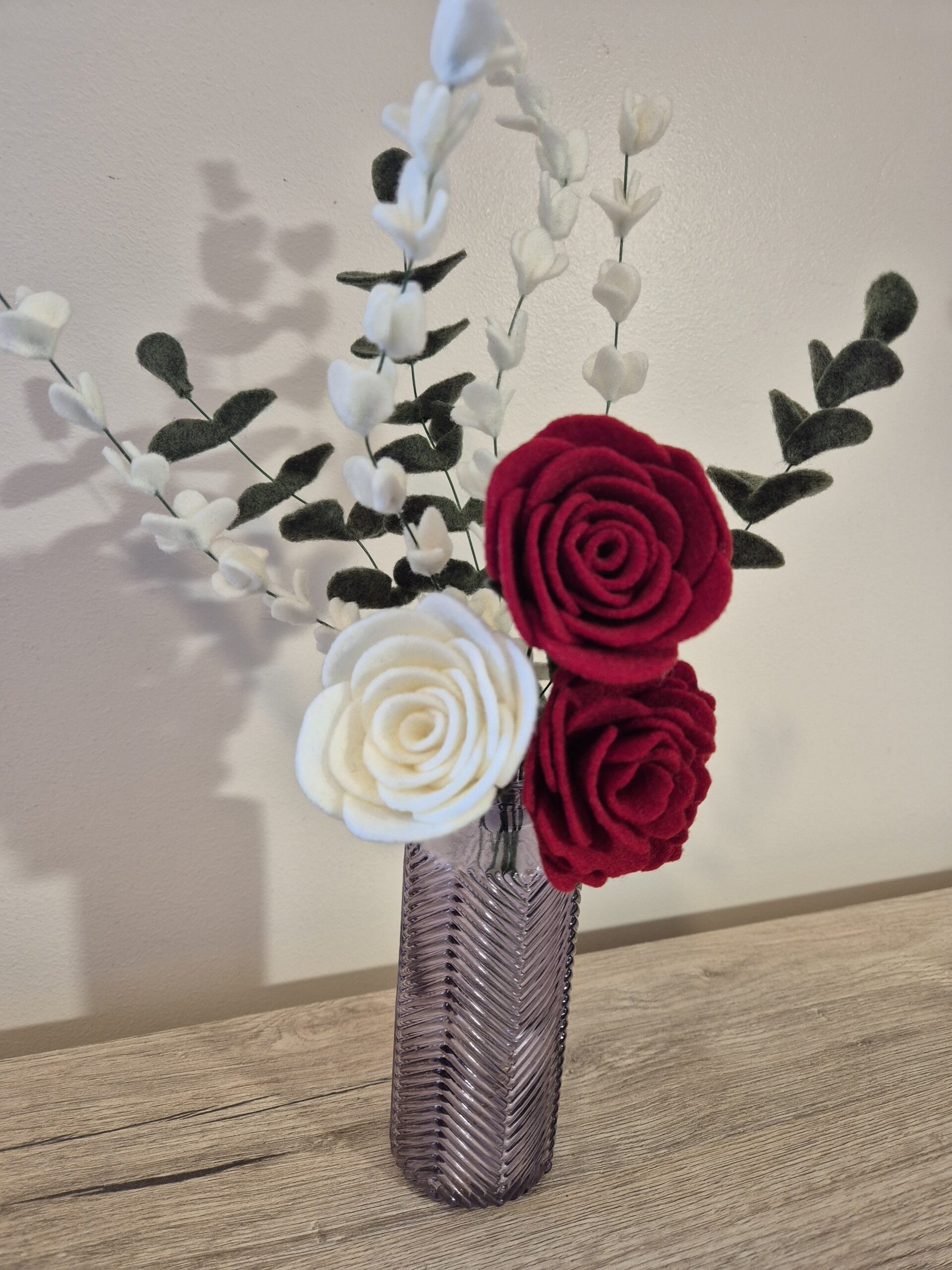 il est composé de 3 roses et d’un feuillage eucalyptus et fleurs blanche.