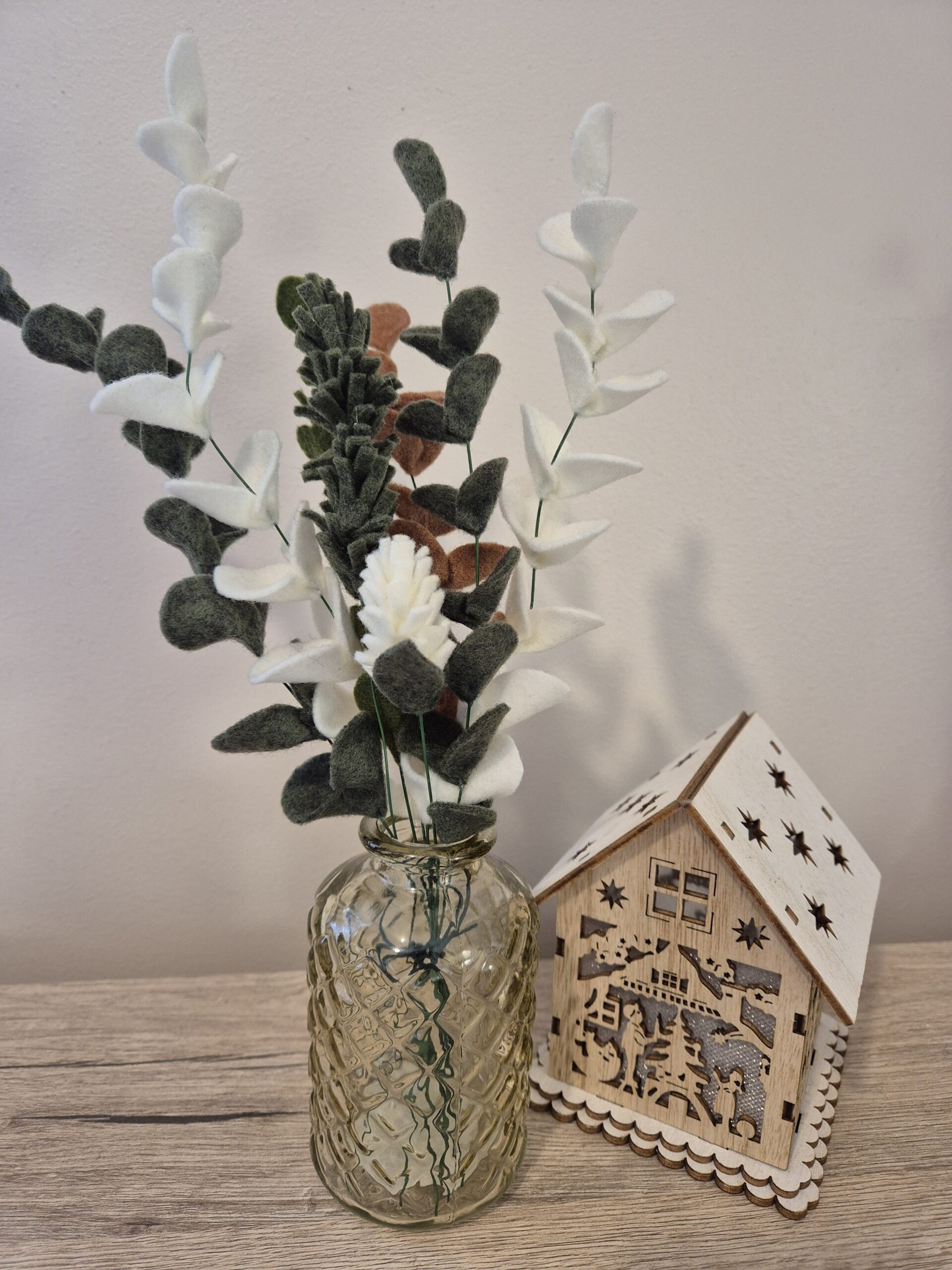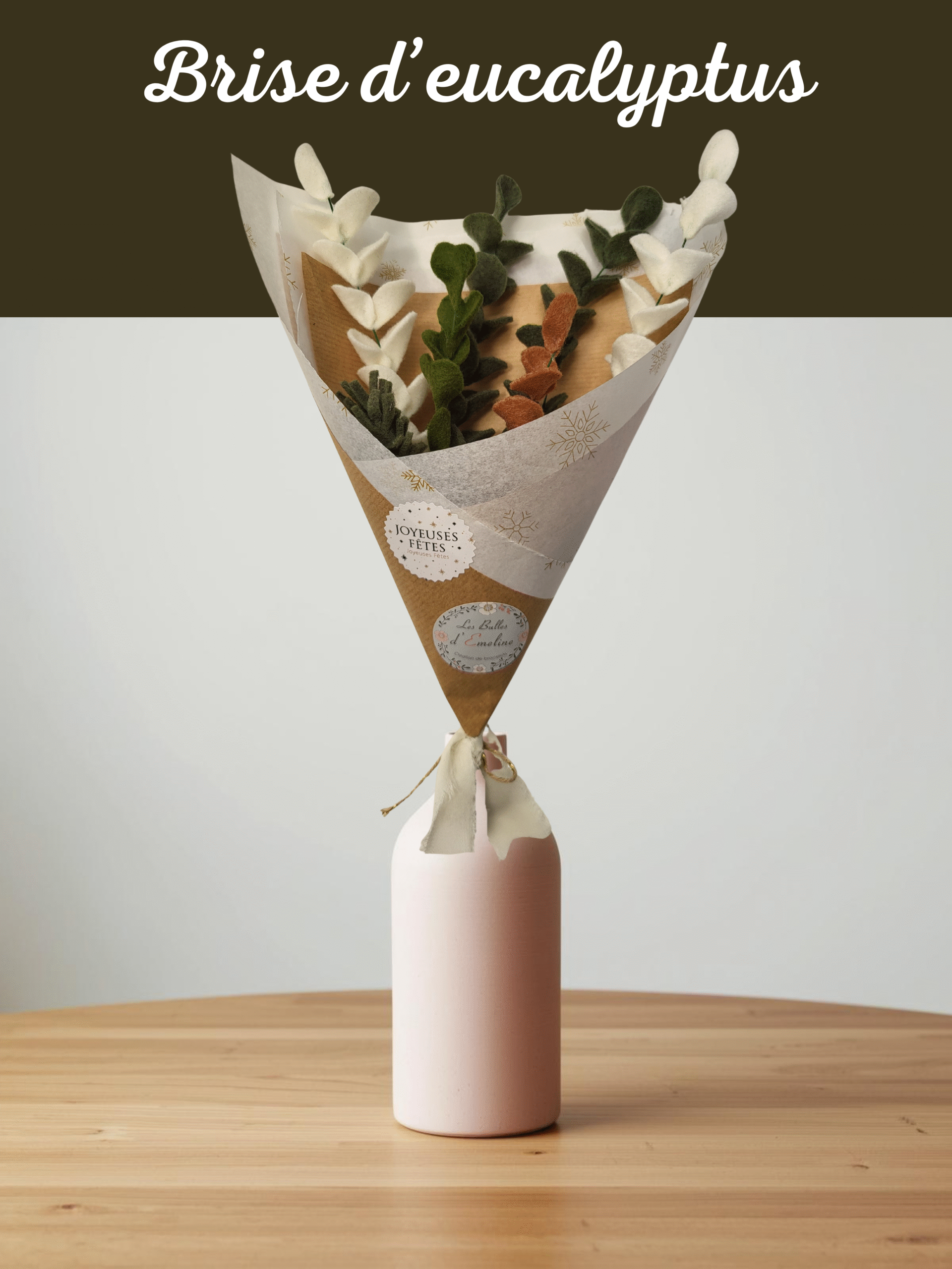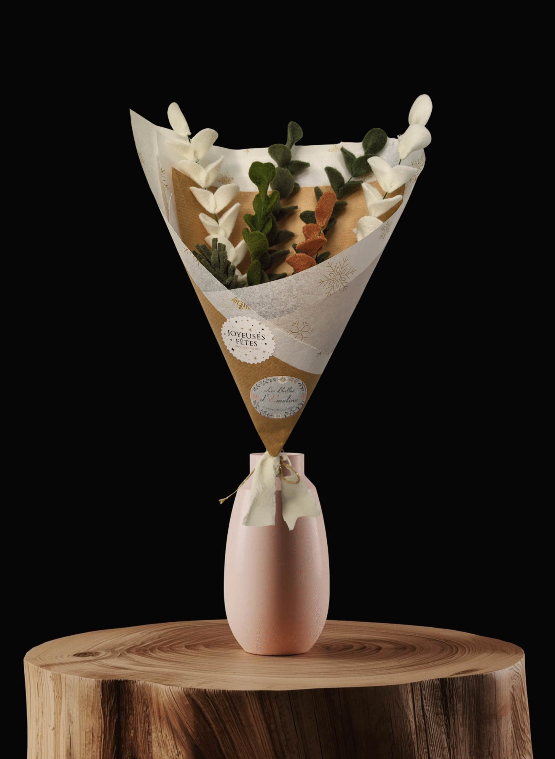 Ajoutez une note végétale intemporelle à votre décoration avec ce bouquet en feutrine eucalyptus et sapin : une création unique qui allie design, poésie et durabilité.